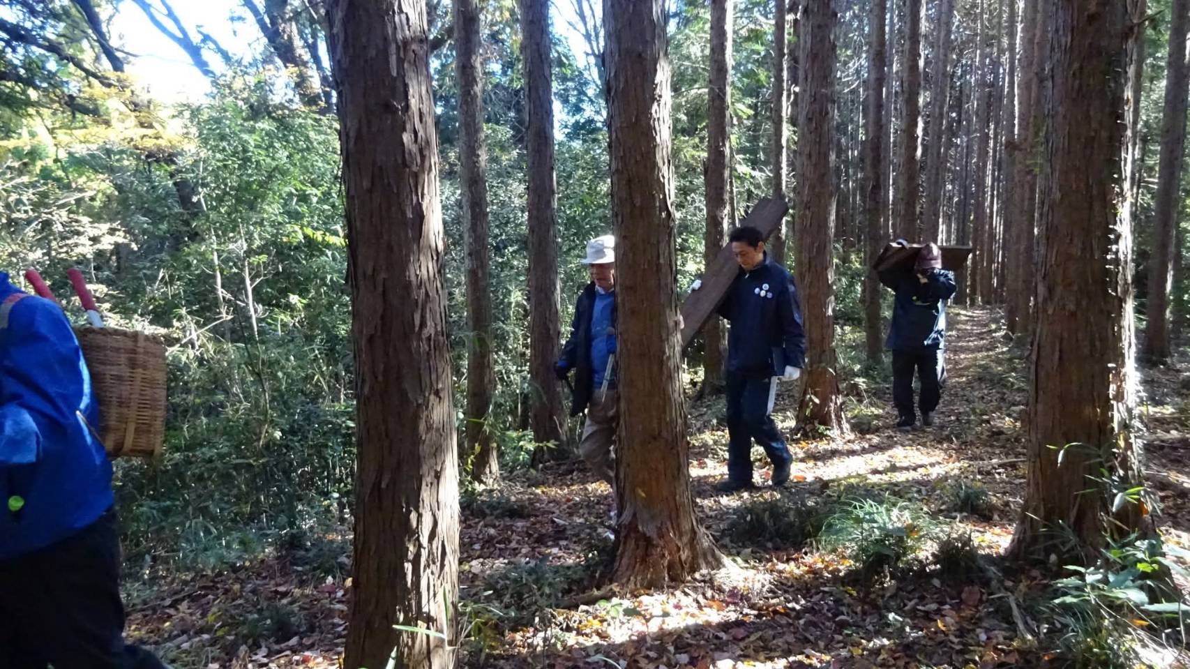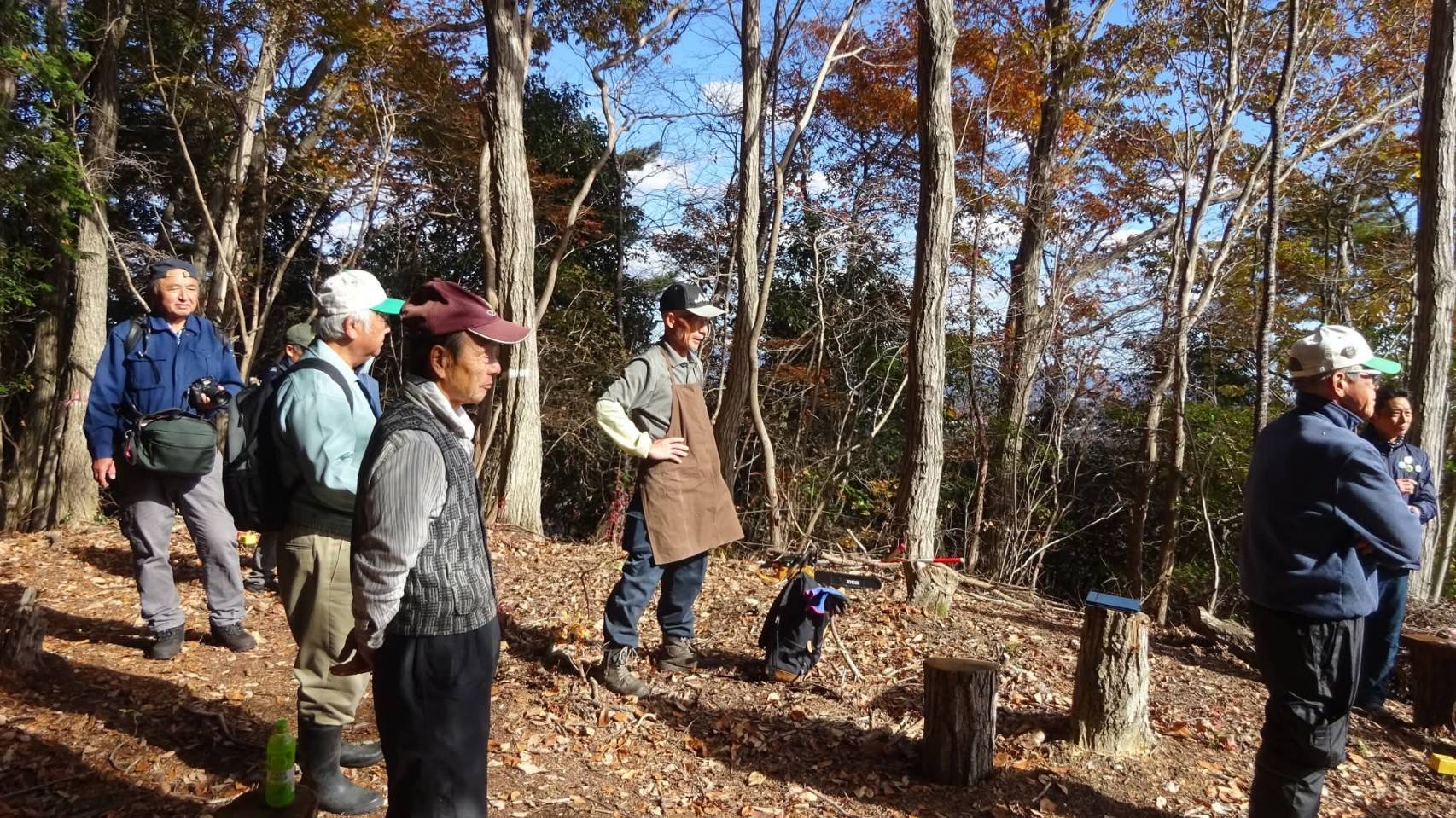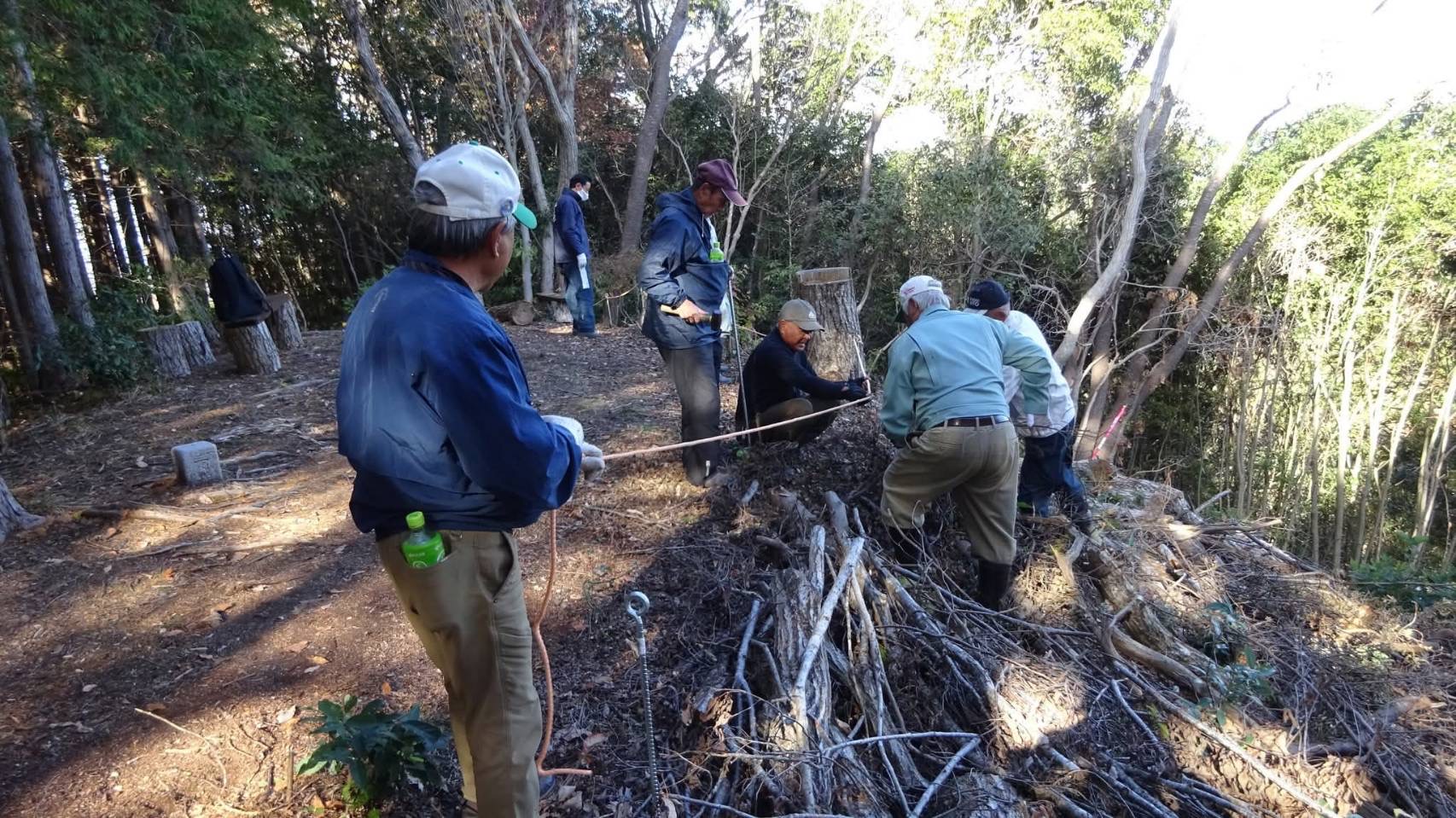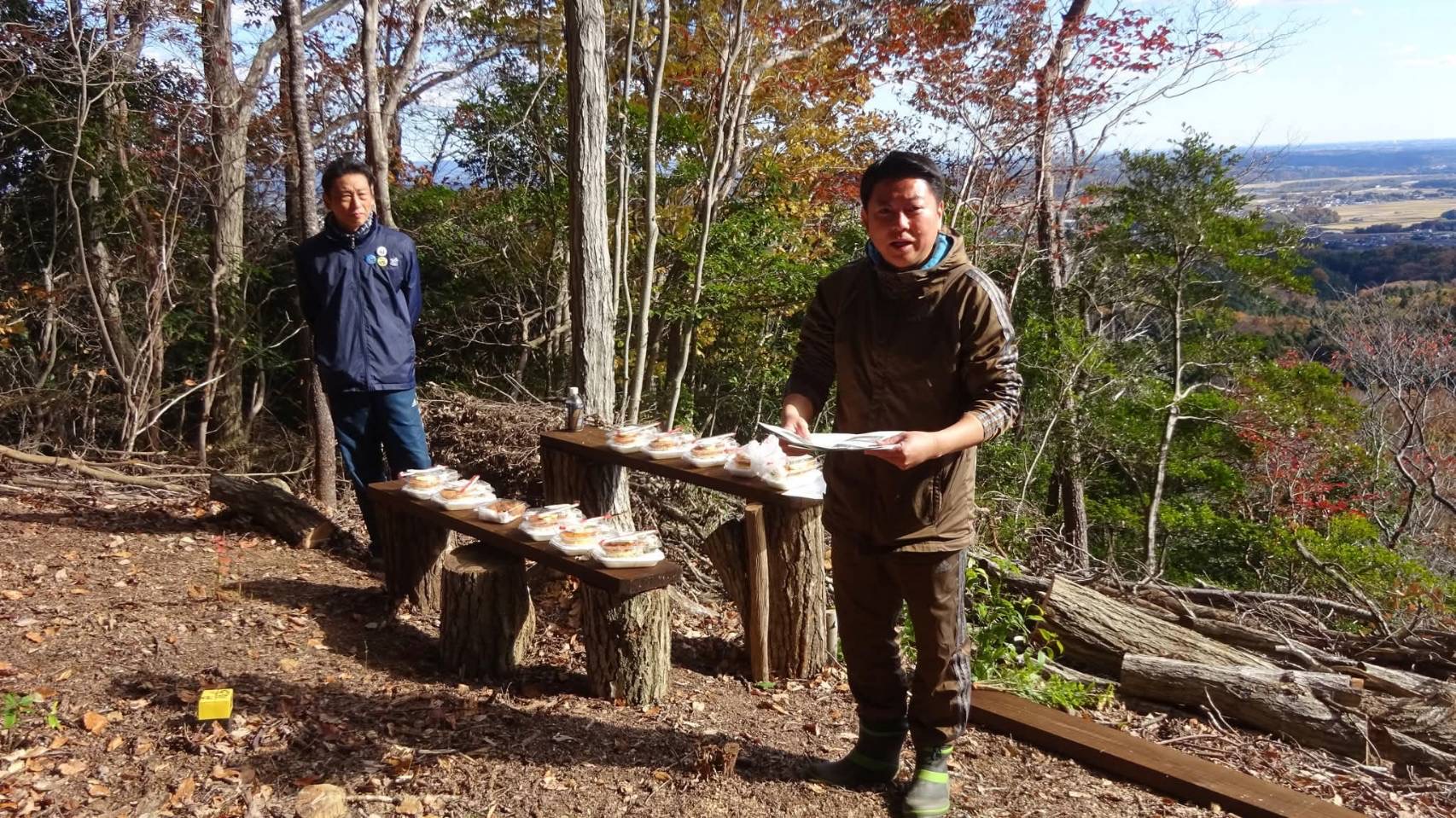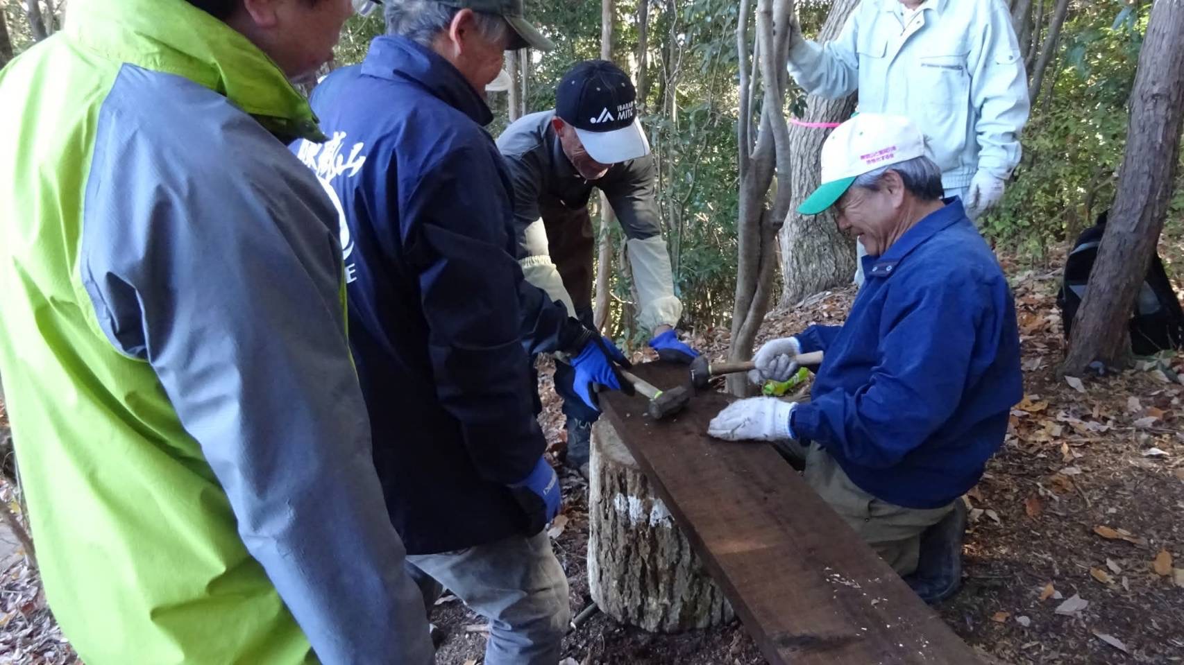 ベンチ、テーブルの材料は工事用渡り板と伐採したコナラの幹を玉切りした丸太を使用しました。