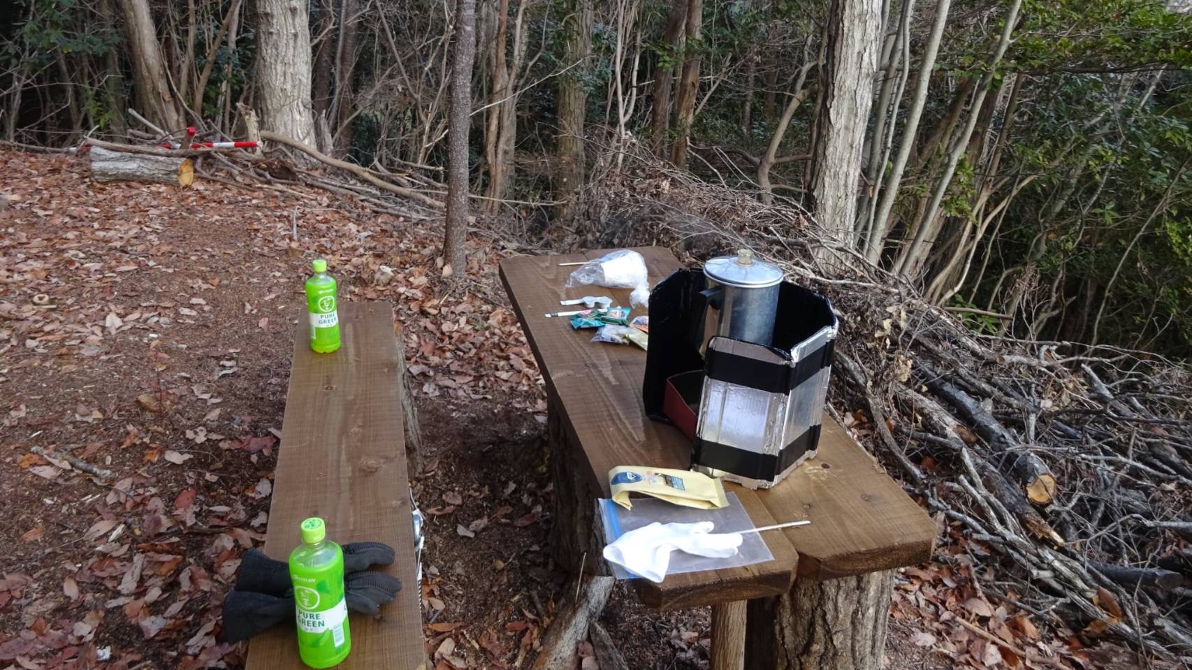 パノラマ看板は伐採したコナラの切り株を斜めにチェーンソーでカットして取り付けました。Cafeあかさわ目の前の看板はCafeに見立てたテーブルベンチの横にある小さな山桜の幹にひもで結びつけました。