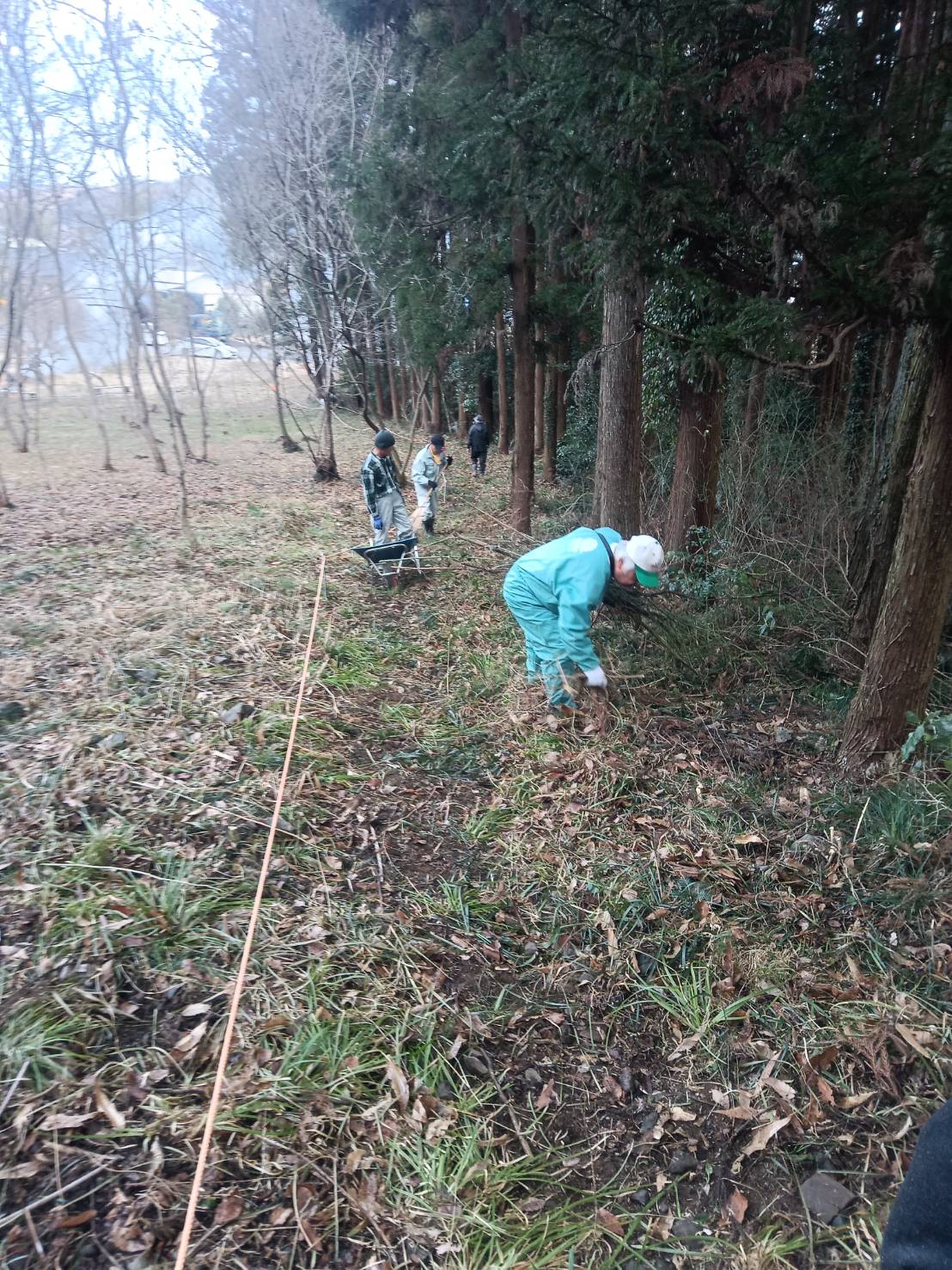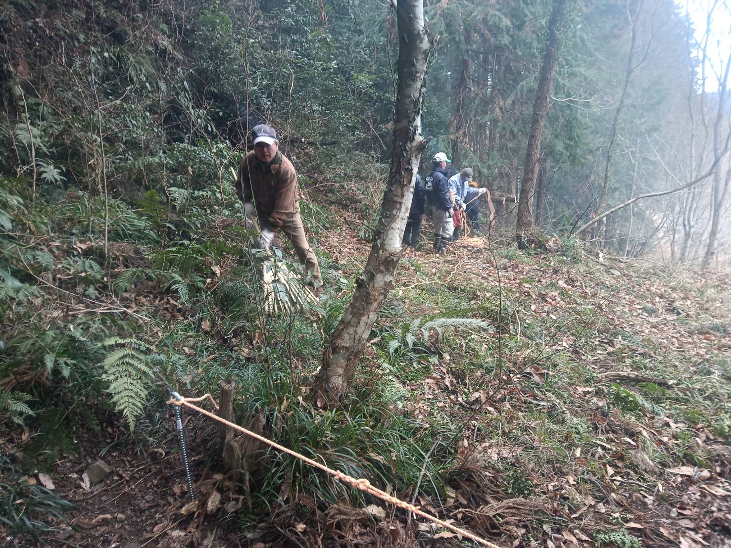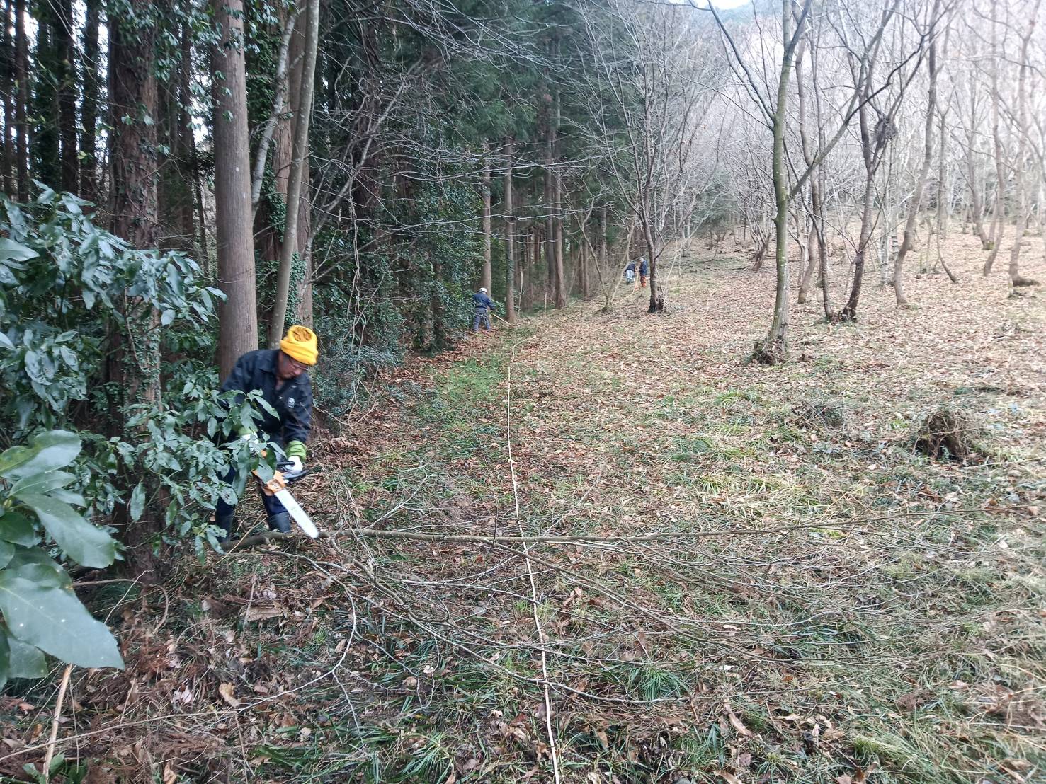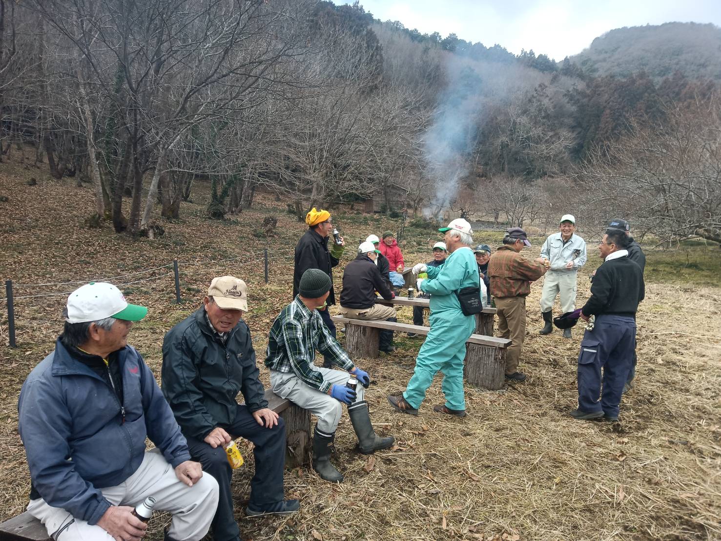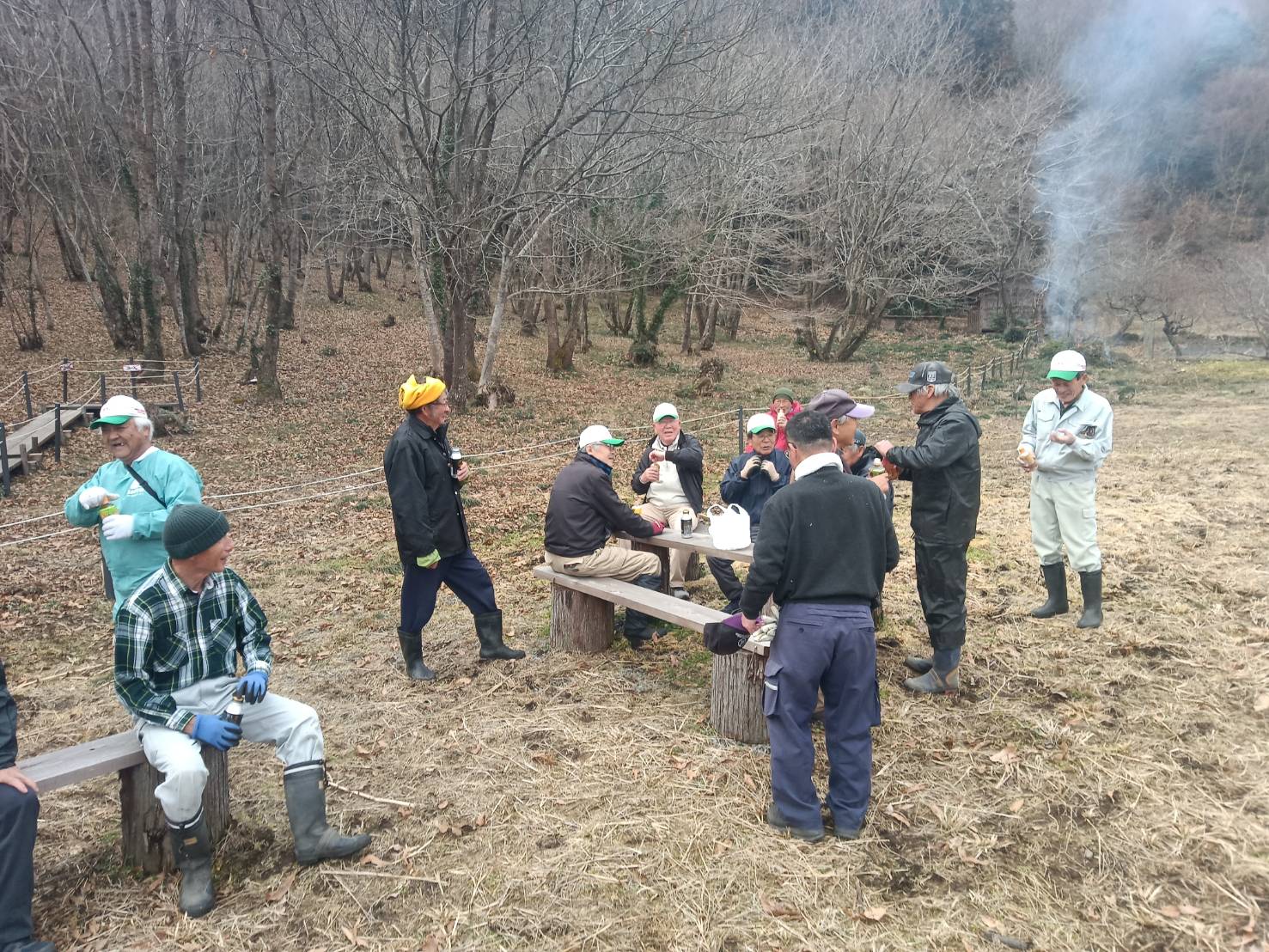3月28日のカタクリまつりに備えて場内にある枯れ枝など集めて焼却、カタクリ見学するため周回道を造りました。周回道には不要木を伐採してから金杭を立ててそこにロープを張りました。作業終了後は用意された暖かい甘酒をいただきました。
