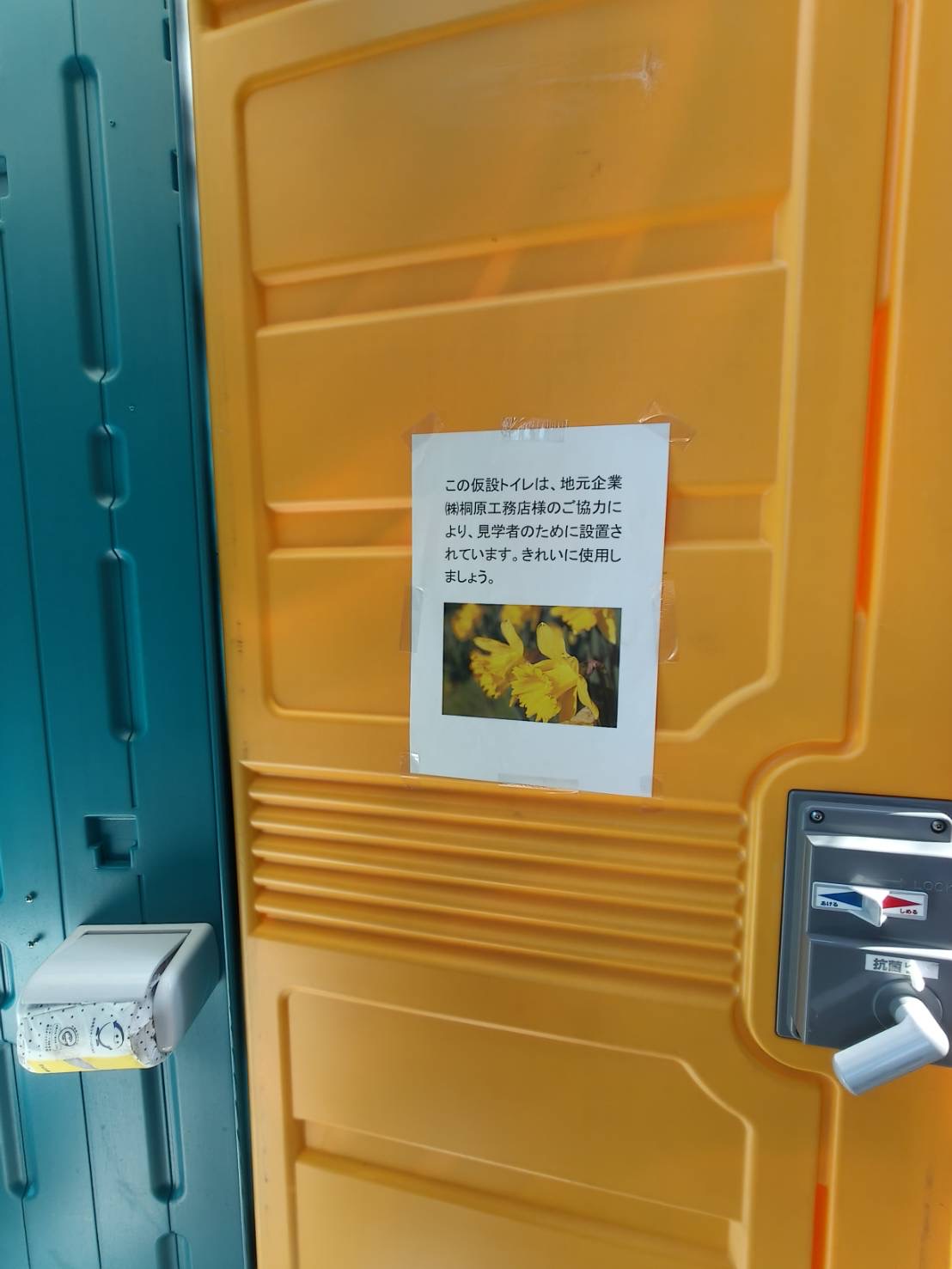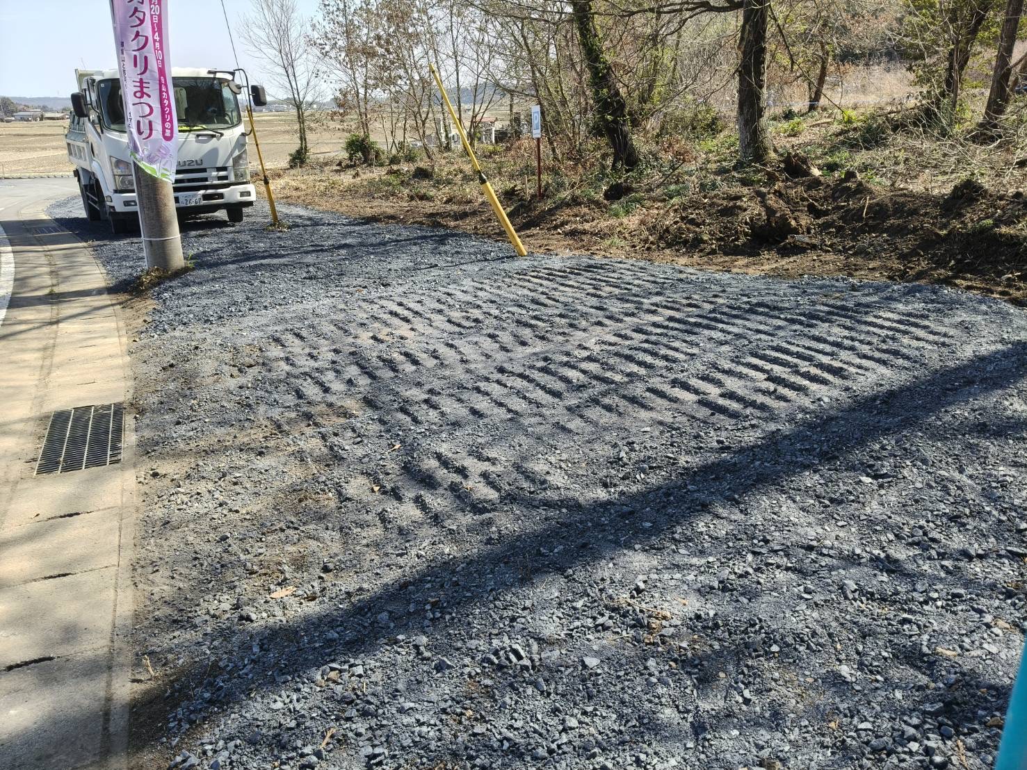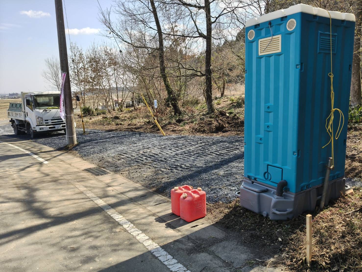 桐原工務店様にカタクリまつりのために仮設トイレの設置と駐車場へ砕石投入整地を無償でやっていただきました。