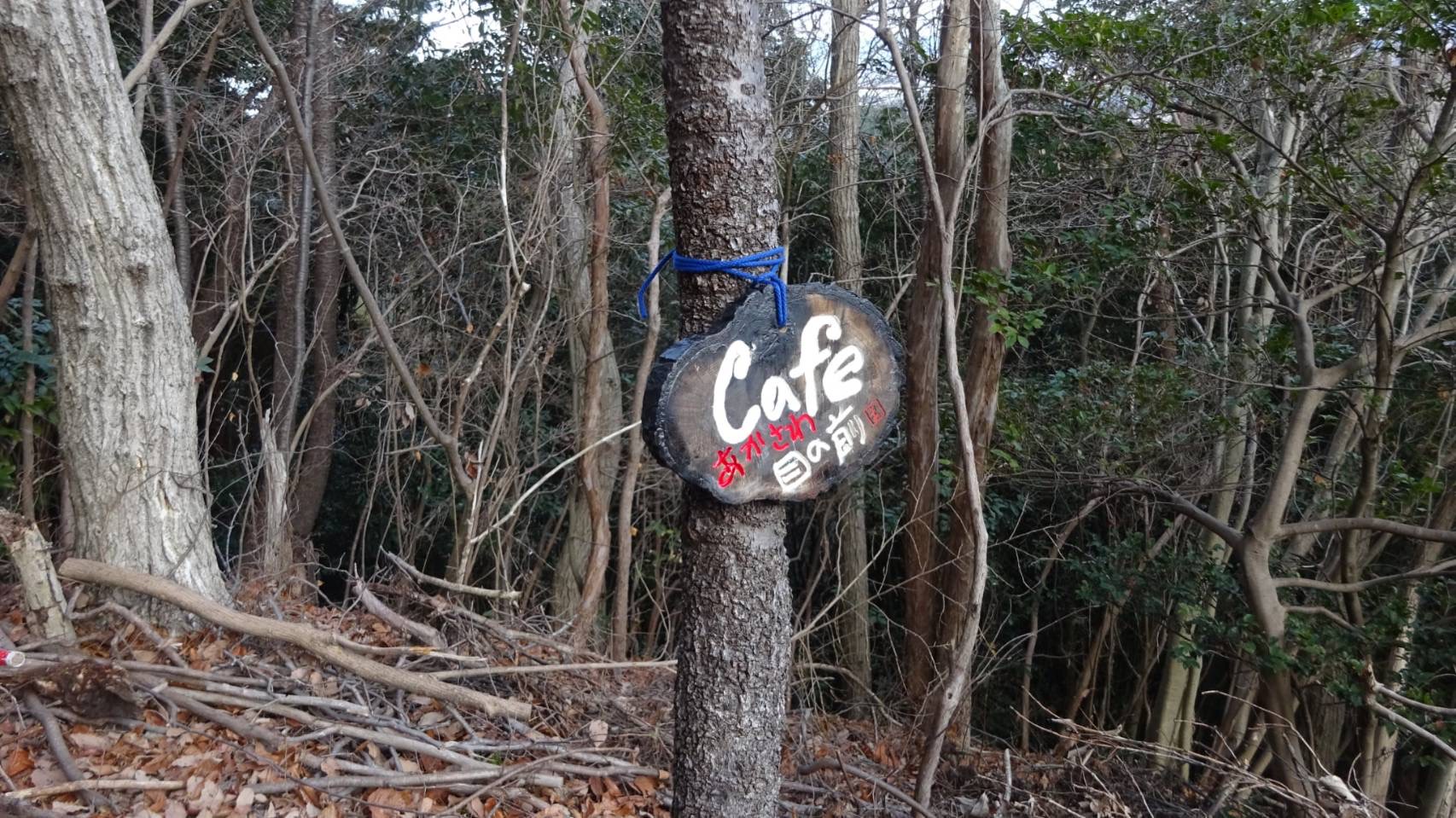 パノラマ看板は伐採したコナラの切り株を斜めにチェーンソーでカットして取り付けました。Cafeあかさわ目の前の看板はCafeに見立てたテーブルベンチの横にある小さな山桜の幹にひもで結びつけました。