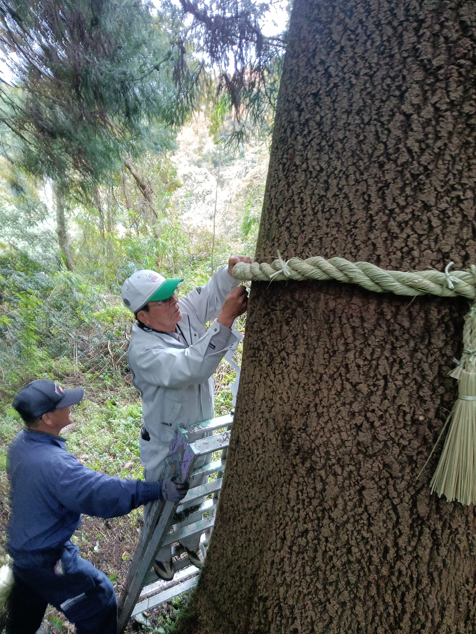 この大桐の発見は偶然の産物と言えます。もともとは常陸の国ロマンチックアルプス(道の駅かつらから物産センター山桜までの登山道)を整備する中で、私たちが一押しとするのは山桜の巨木が2本並んで立つ「長寿夫婦桜」でした。これは山の山頂に位置しており、きっとこの登山道の目玉になると2024年には「安全祈願祭」を行ったりと中心的な巨樹でした。この大桐はこの桜から既存の山道への近道の道中で発見しました。